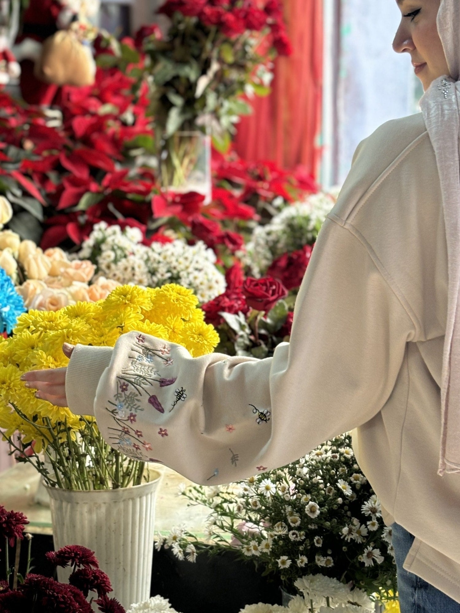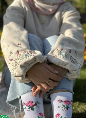This sweatshirt features delicate floral embroidery on the sleeves, capturing the beauty of nature with soft, intricate blooms. The subtle design adds a feminine, refined touch, while the oversized fit ensures effortless coverage and comfort, perfect for layering or wearing as a standalone piece.