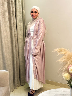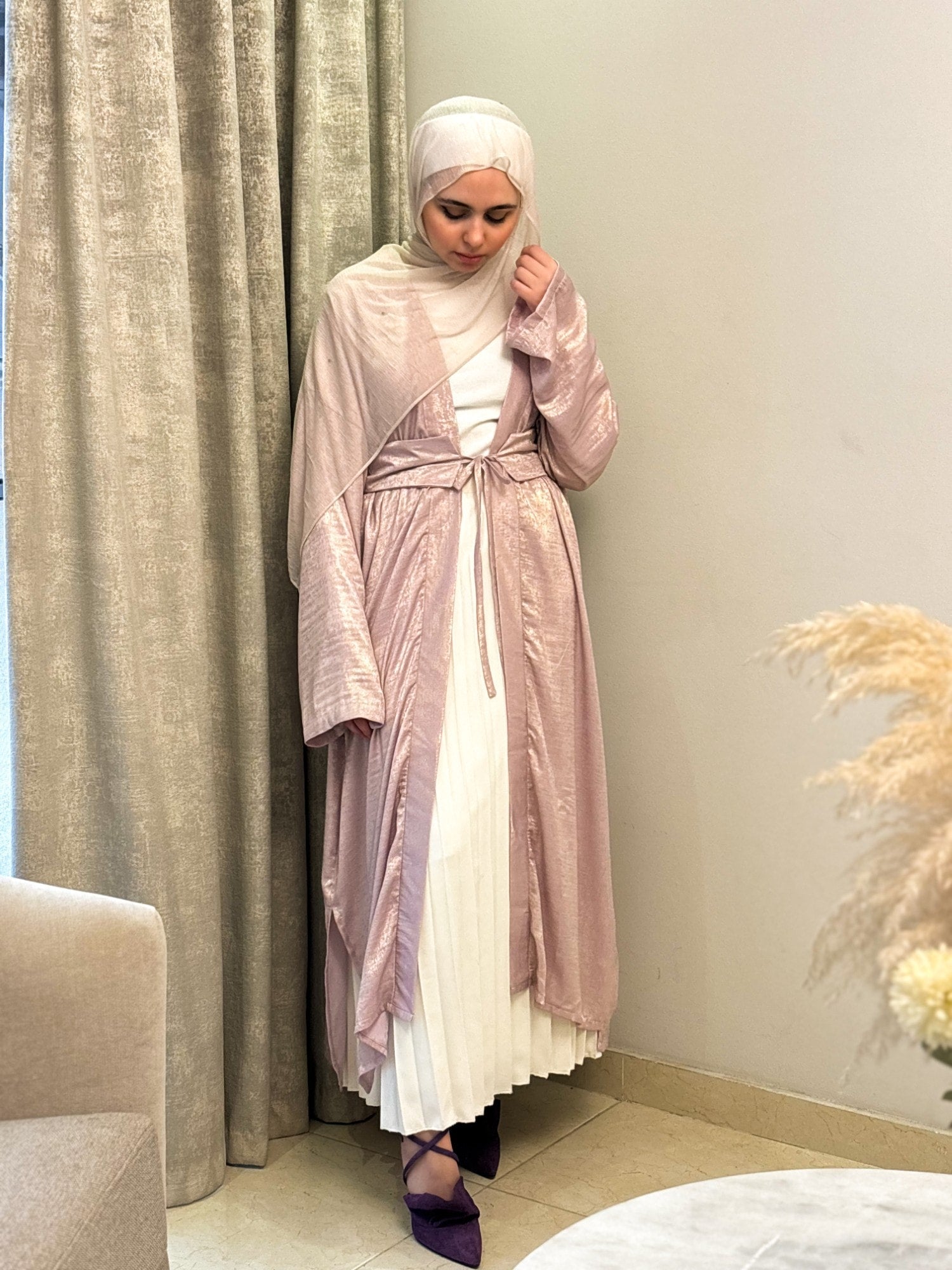 "نچم" is a kaftan that embodies glamour and grace, made from luxurious glittery satin fabric. The name نچم (Nujum), meaning "stars" in Arabic, reflects the sparkling elegance of this piece—designed to make you shine bright, just like the stars in the night sky.
