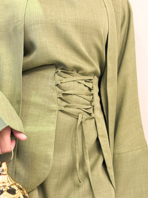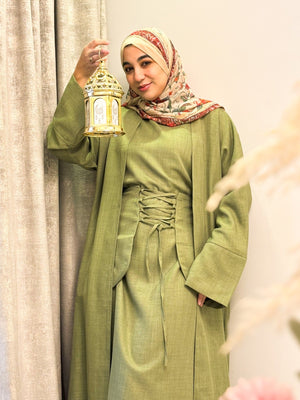 This set includes a sleeveless basic dress, a kaftan, and a corset belt—perfect for layering and creating a look that’s uniquely yours. Available in three stunning colors—bronze orange, green, and beige—the soft linen fabric keeps you cool and comfortable, while the design offers a chic, modest silhouette.