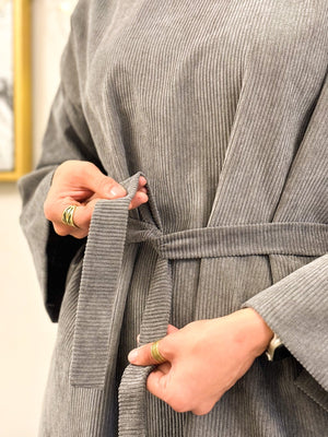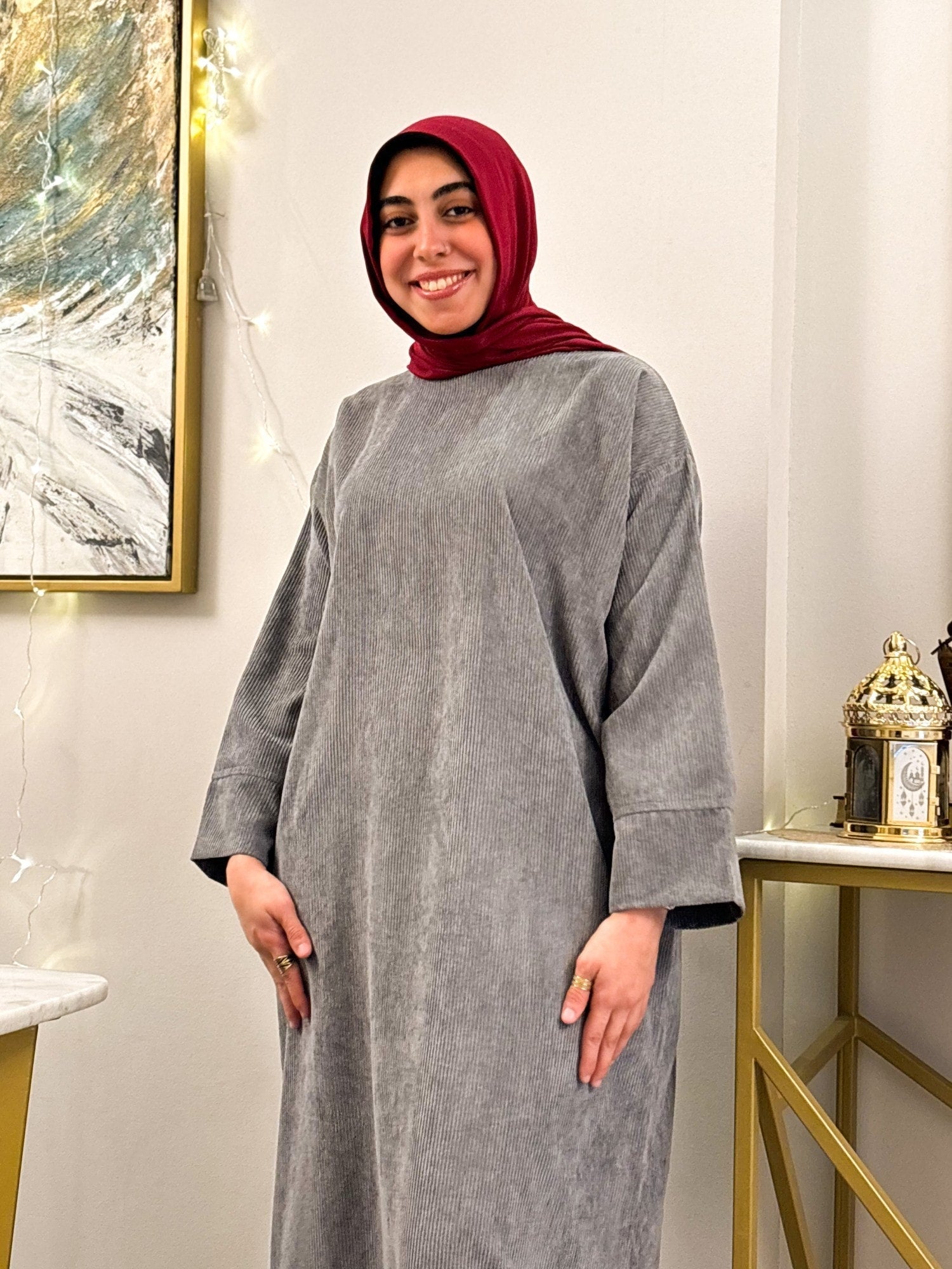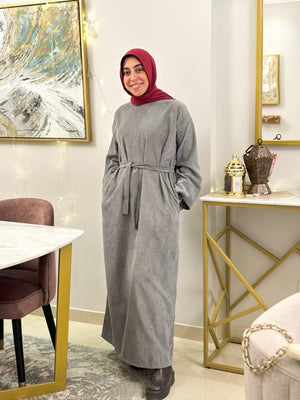 This abaya features a classic belt to accentuate your shape, available in two versatile colors—olive and grey. The gentle texture of the corduroy fabric offers a refined yet relaxed look, perfect for both everyday wear and special occasions.